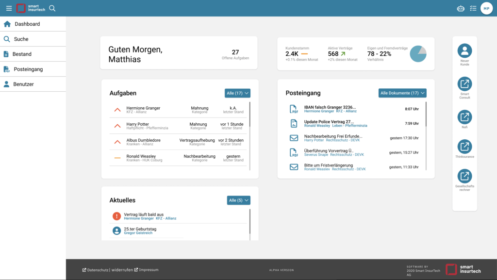 Weitere Features, an welchen wir arbeiten, sind die Neuantragserfassung, die Erfassung von Fremdverträgen und das Anstoßen einer Bestandsübertragung – alles synchronisiert mit unserem Maklerverwaltungsprogramm SMART ADMIN (FinanzOffice).