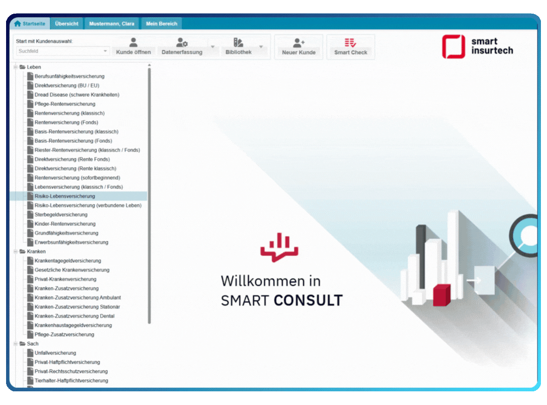 Der Smart Consult Schnellrechner umfasst sämtliche Services rund um die Berechnung, den Vergleich und Abschluss von Versicherungstarifen. Mit der Smart Consult Konzeptberatung erhalten Sie eine ganzheitliche Beratungstechnologie, die eine strukturierte Konzeptberatung mit der Analyse von Versorgungslücken und Mehrthemenberatungen ermöglicht. Zudem bietet die Smart Consult Konzeptberatung die Möglichkeit, umfangreiche Vertriebsstrukturen mit Sichtrechten und Zugriffsteuerung abzubilden für eine erfolgreiche Vertriebssteuerung inklusive Tippgeberstrukturen.