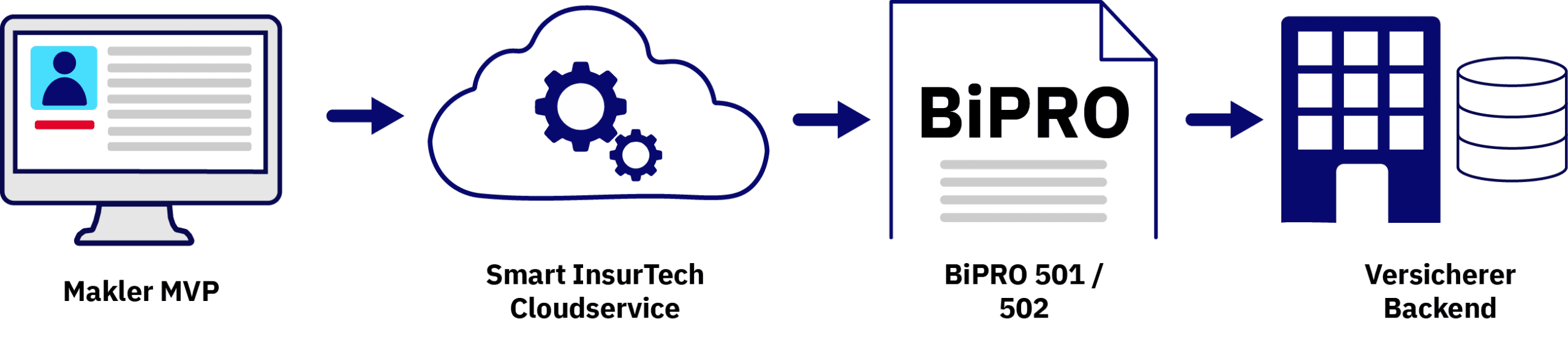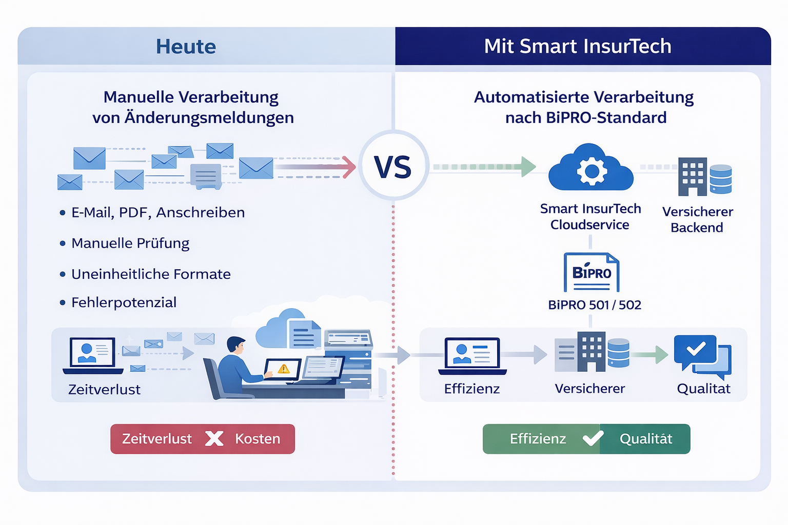 Die Cloudservices von Smart InsurTech ersetzen unstrukturierte Maklerkommunikation durch standardisierte, klar definierte Änderungs- und Bestandübertragungsmeldungen. Über die BiPRO-Normen 501 und 502 werden Änderungsinformationen strukturiert übermittelt und können automatisiert bis ins Bestandssystem verarbeitet werden.